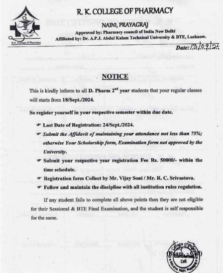 This is kindly inform to all D.Pharma 2nd year Classes has been started from 18/09/2024 onwords. Last date for 2nd year Registration is 24/09/2024.